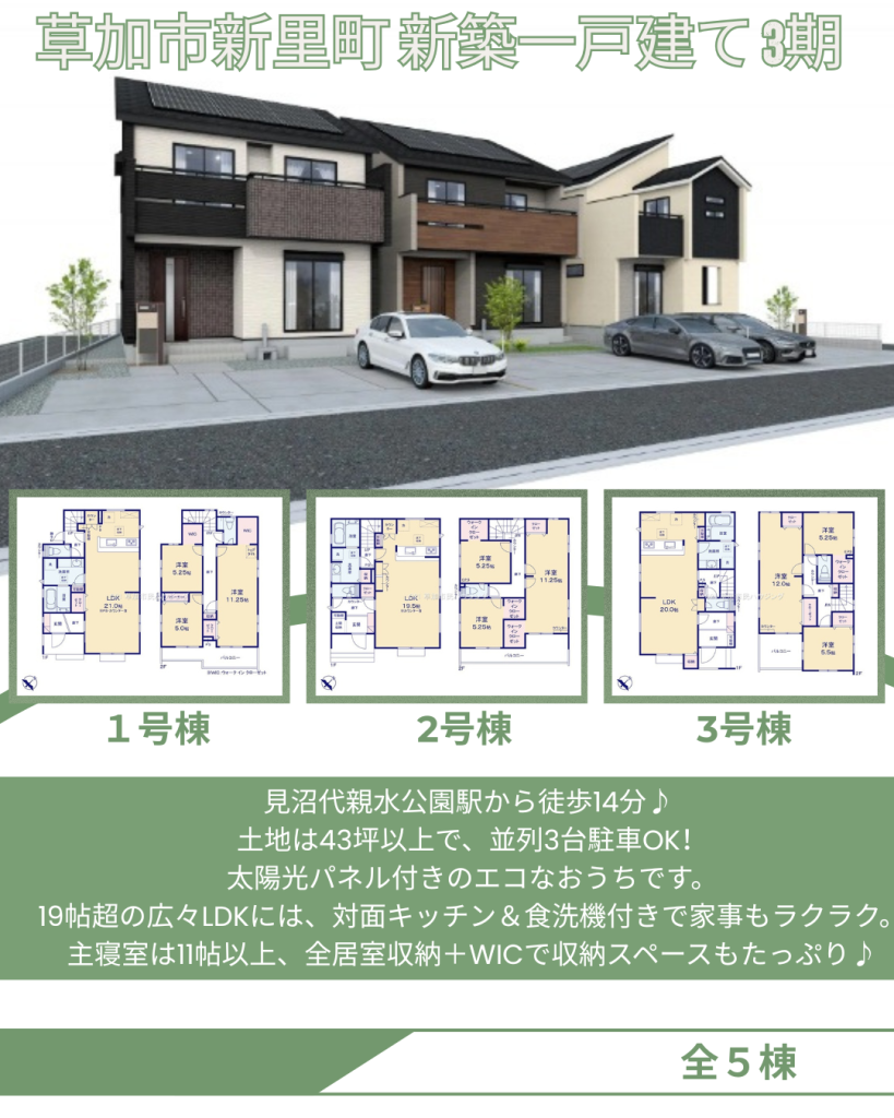 草加市新里町に登場した、全5棟の新築一戸建て「3期」分譲。
