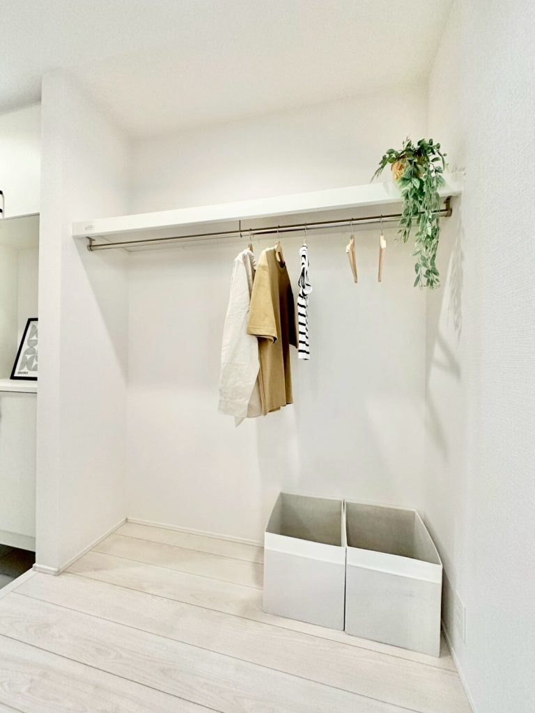 玄関に設けたファミリークロークは、ハンガーパイプ付きでアウター類をそのまま収納可能。