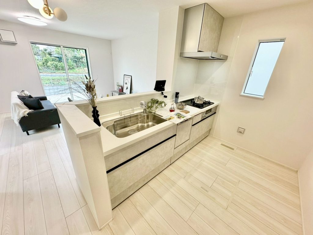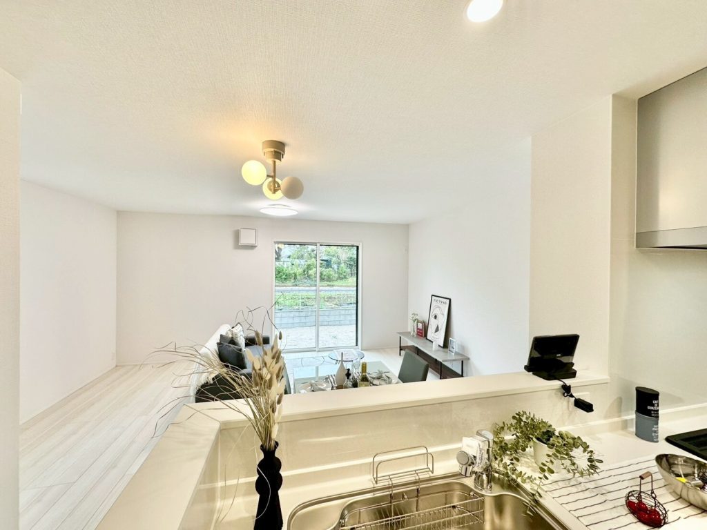 対面キッチンとの距離感も確認でき、毎日の家事動線もイメージしやすくなっています。