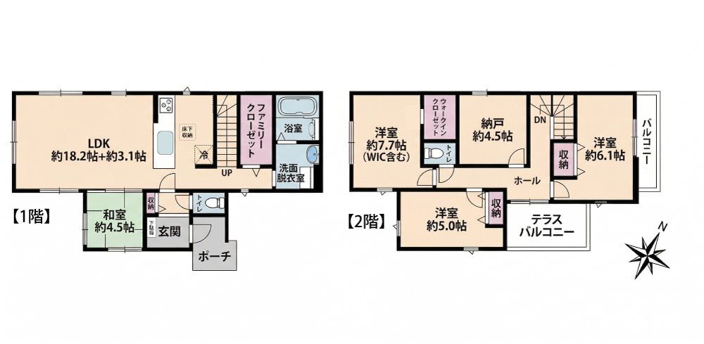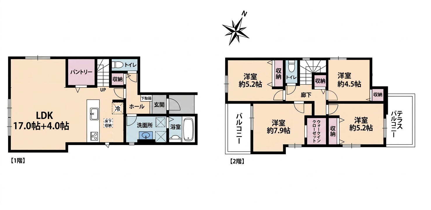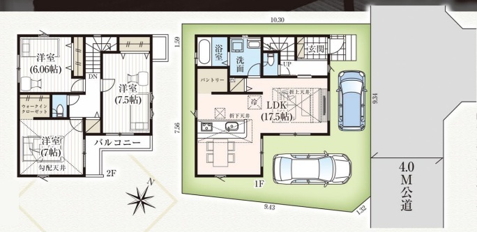 主寝室7.5帖、全居室6帖以上、全室収納、パントリー・WICで収納力も◎