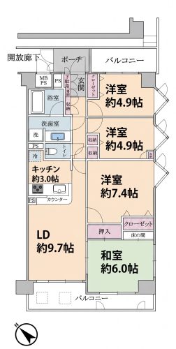 4LDKのゆとりある間取りに加え、角部屋ならではの採光・通風の良さが魅力。