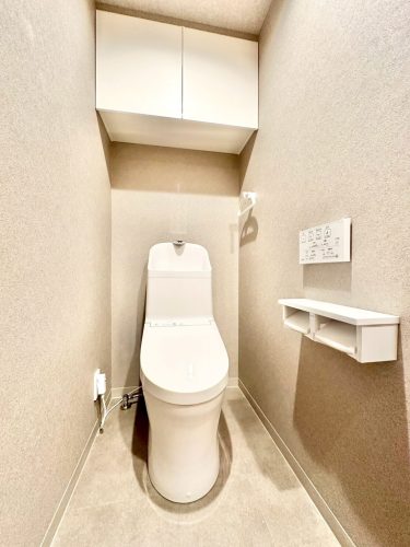 トイレ収納を備え、トイレットペーパーホルダーを2ヶ所設置した使い勝手の良い空間。