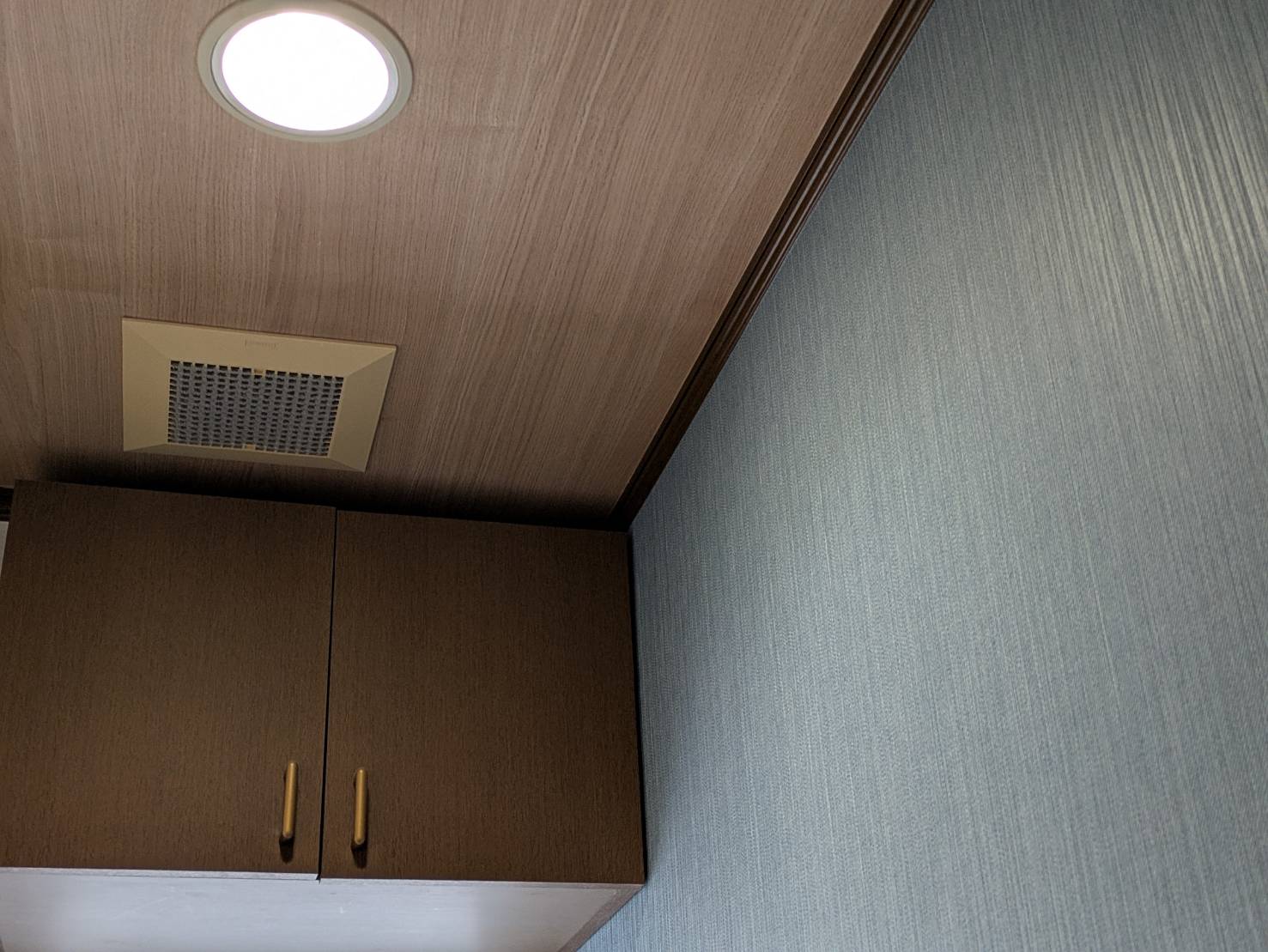 天井: 優しい木目調のクロスを選び、空間に温かみと奥行きをプラス。