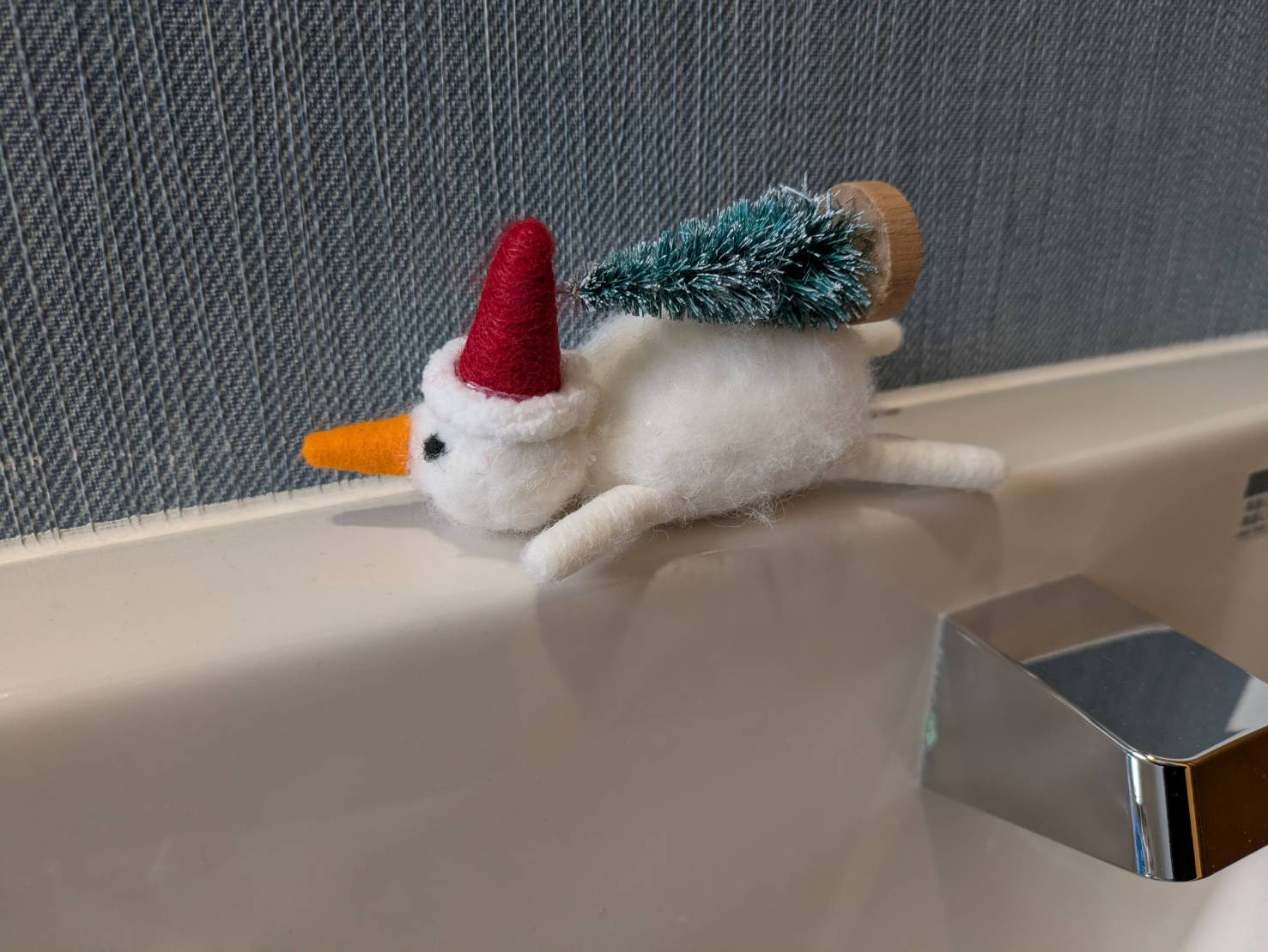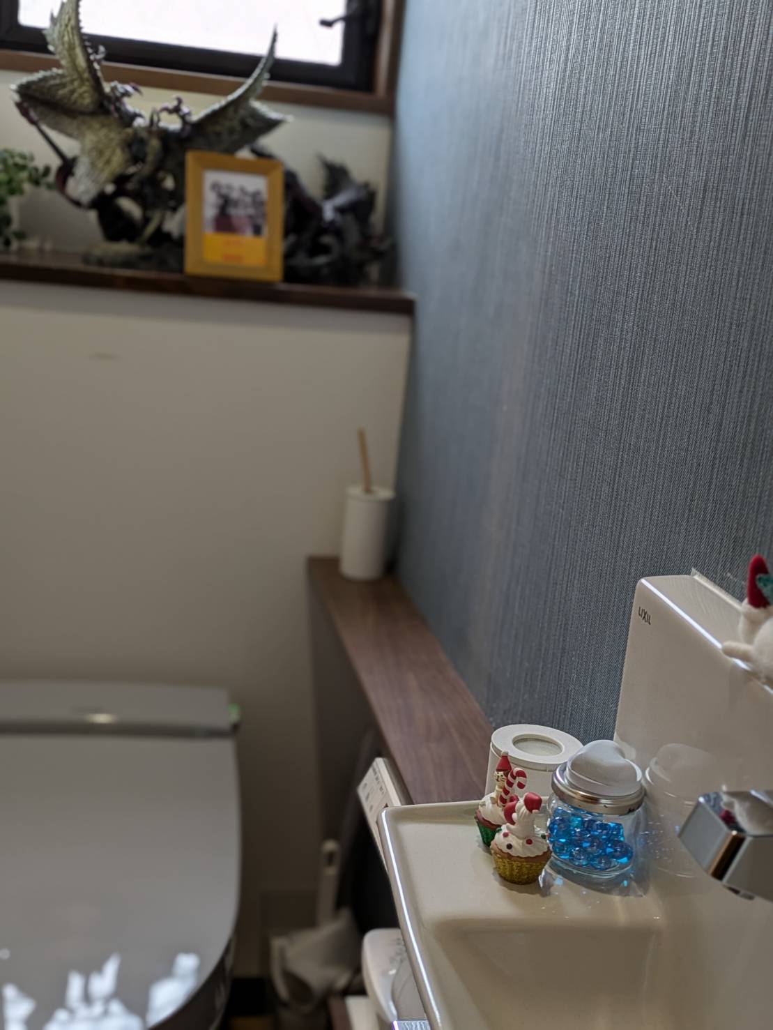 手洗いカウンターの癒やし小物:今回は、ちょうどクリスマスシーズンなので、サンタ帽をかぶった『むぎ』ちゃんやネコちゃんのカップケーキモチーフなど、可愛らしいクリスマス小物をちょこんと飾ってみました。青いビーズが入った瓶も、まるで雪の結晶みたいにキラキラと綺麗なんです。