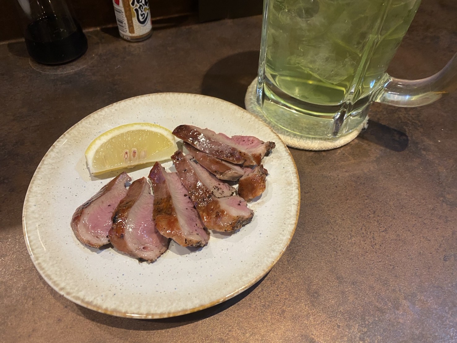 『ハツ刺しを軽く炭火で炙ったもの』と『いいちこ(麦焼酎)の緑茶割り』です。