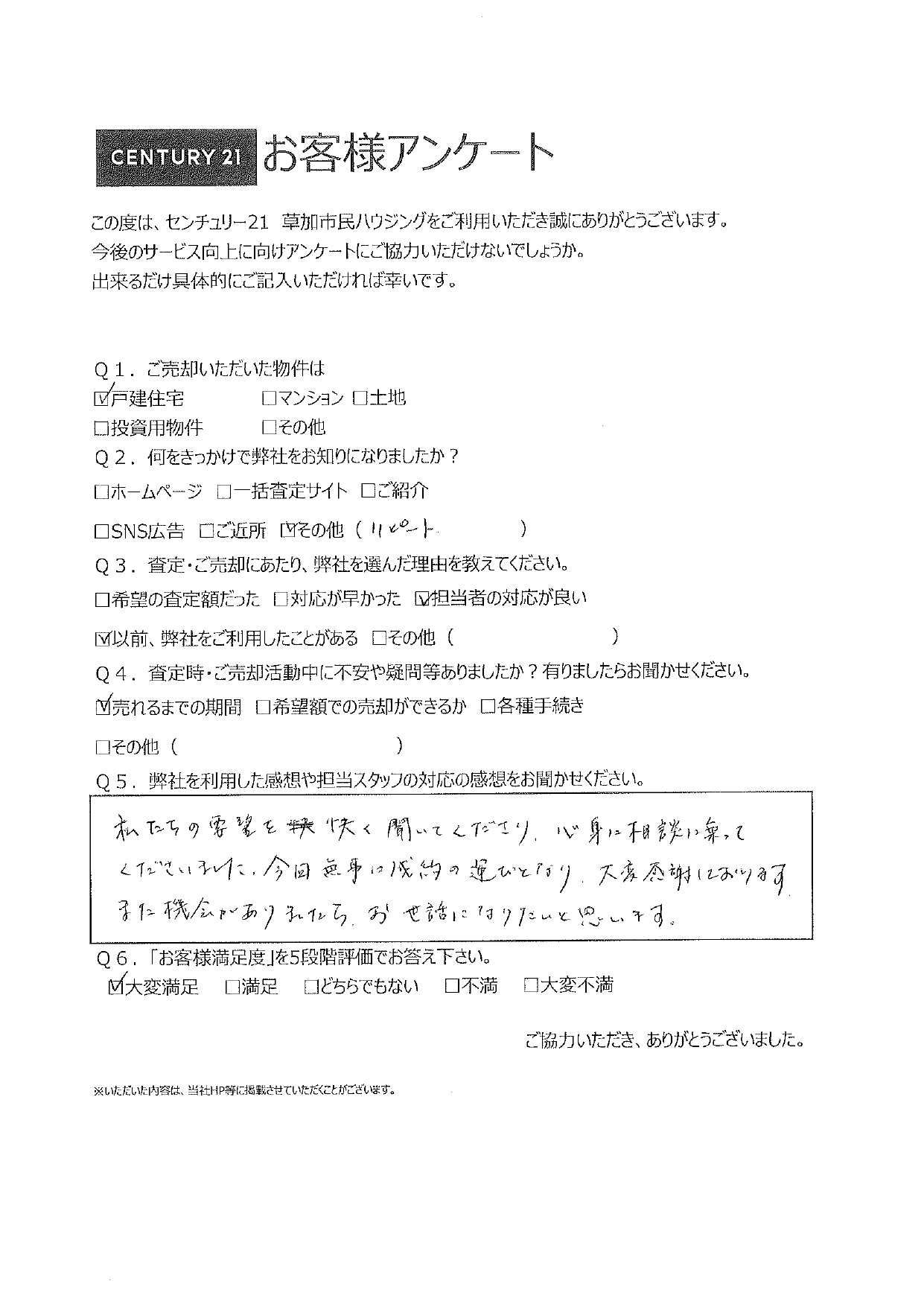 Y様、この度は大切なお住まいのご売却依頼をお任せいただき誠にありがとうございました。